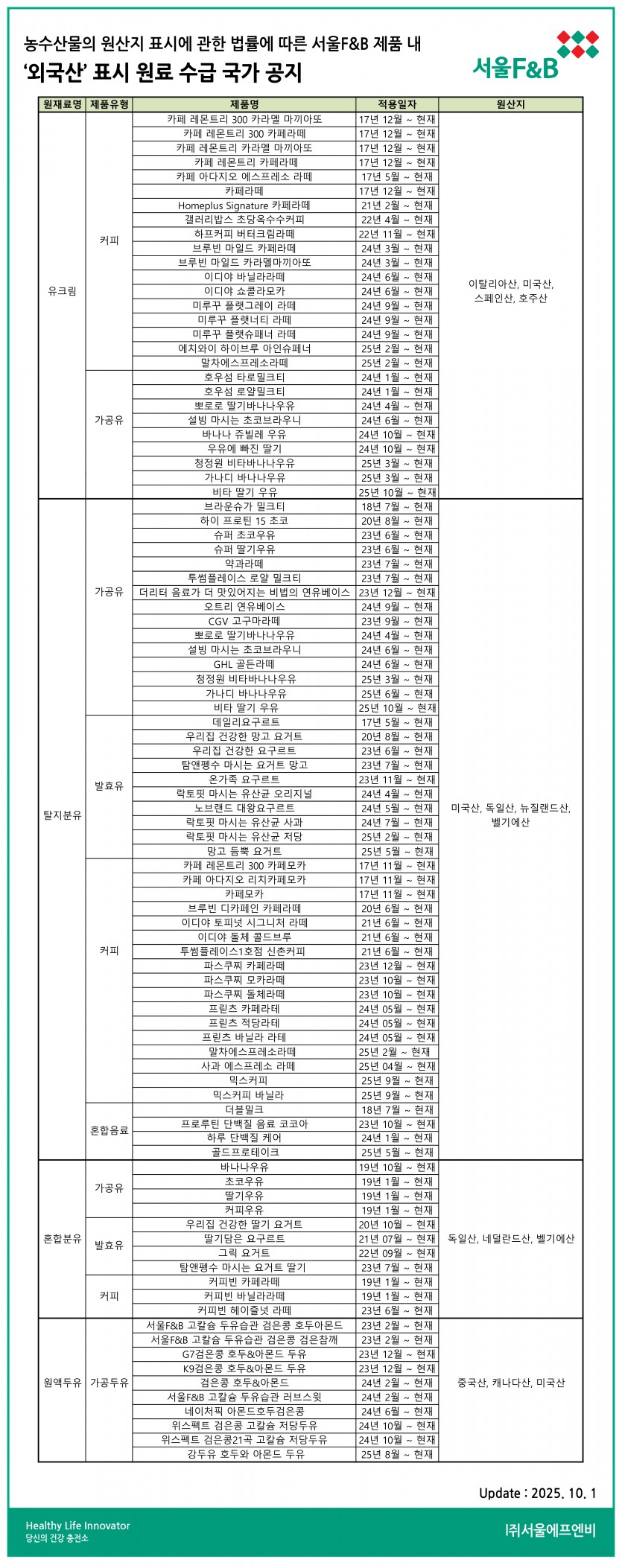 서울에프엔비 외국산 표시원료 수급국가공지 (2025년 10월 1일 기준) 페이지 정보 목록 답변 본문 다음글서울에프엔비 외국산 표시원료 수급국가공지 (2025년 5월 1일 기준) 25.02.11